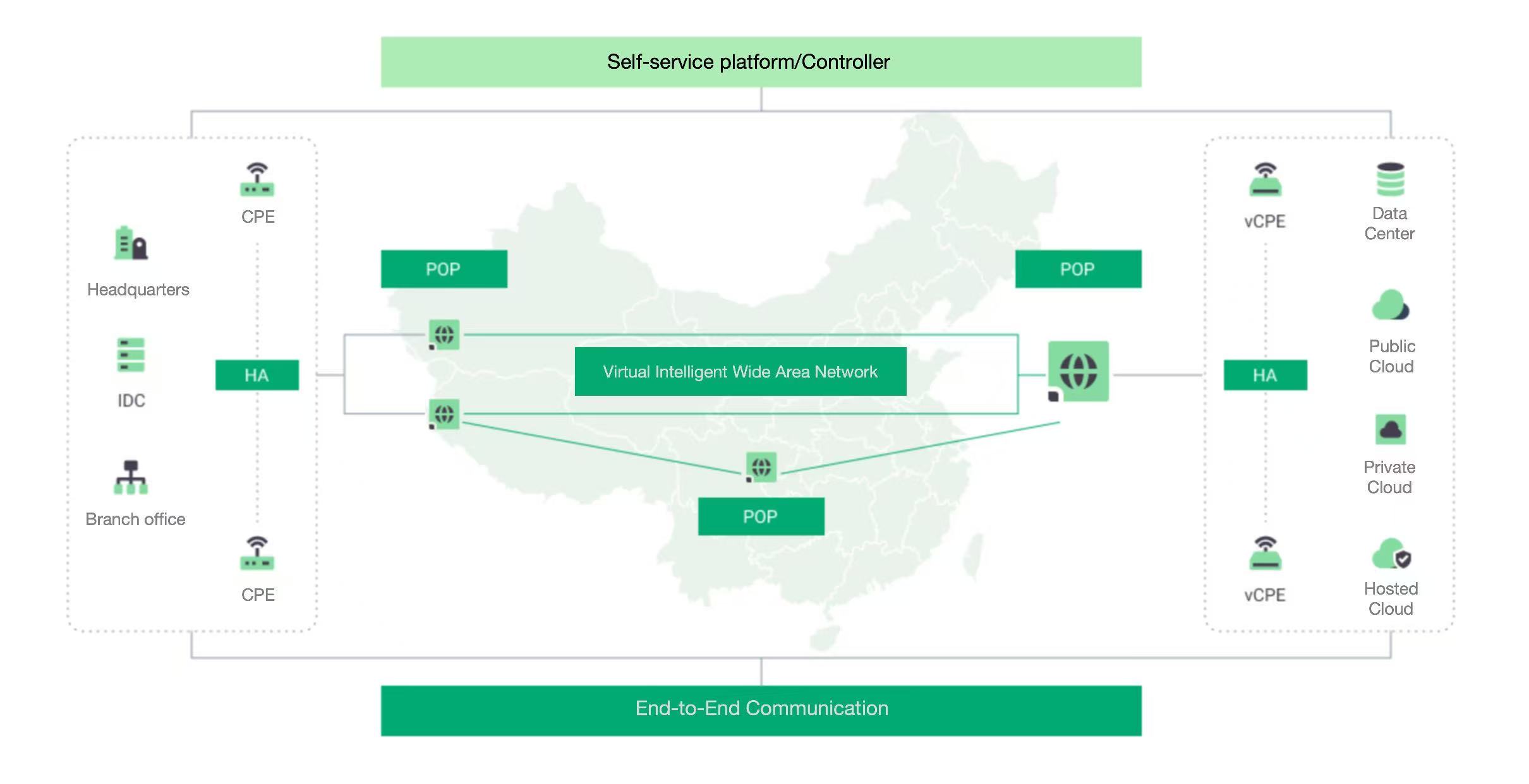 By intelligently scheduling link resources and managing services, it provides enterprises with efficient WAN access and cloud connectivity optimization. This enables users to quickly connect to their dedicated enterprise networks for seamless access to critical cloud applications. Within minutes, it establishes a dedicated network connecting clouds, data centers, and enterprise branches, enabling seamless interconnection, on-demand scalability, and intelligent traffic management. This delivers high-quality network connectivity and cloud application access at a lower cost.